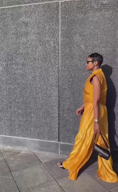 Cet ensemble 3 pièces jaune orangé composé d'un pantalon, haut et kimono, comme son nom l'indique, met en avant l’éclat et la confiance féminine. Une tenue vibrante, élégante et pleine de vie, pensée pour illuminer chacun de vos pas.