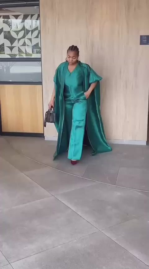 Découvrez notre ensemble 3 pièces Nia, composé d'un pantalon, d'un haut et d'un kimono long.