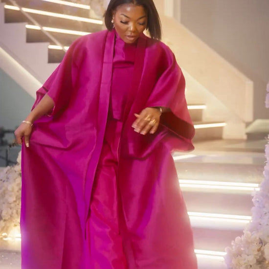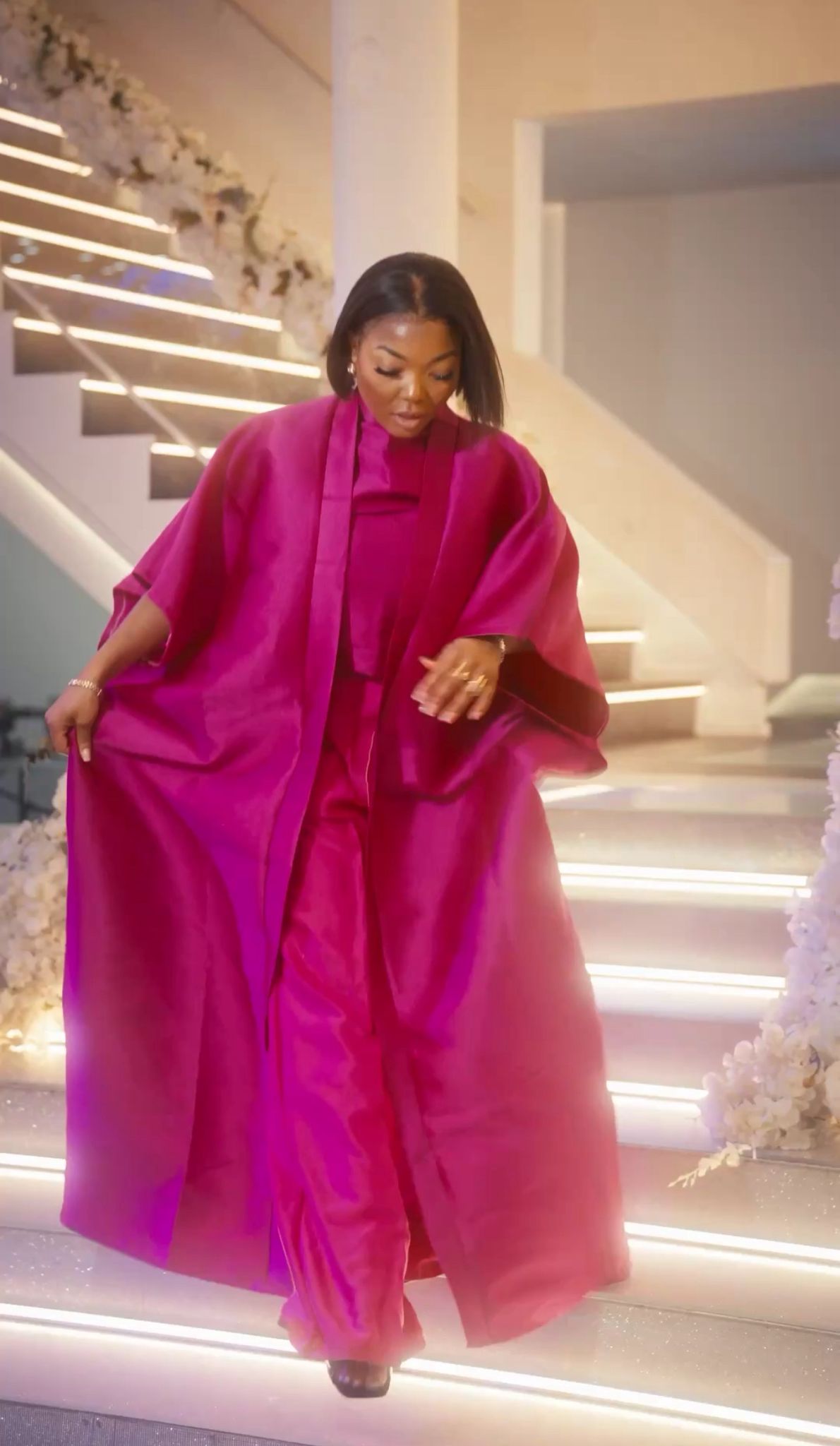 Cet ensemble trois pièces, composé d'un pantalon, d'un haut et d'un kimono, incarne l’élégance lumineuse et la liberté d’esprit. Un look vibrant qui célèbre la confiance, la féminité et la bonne énergie africaine.